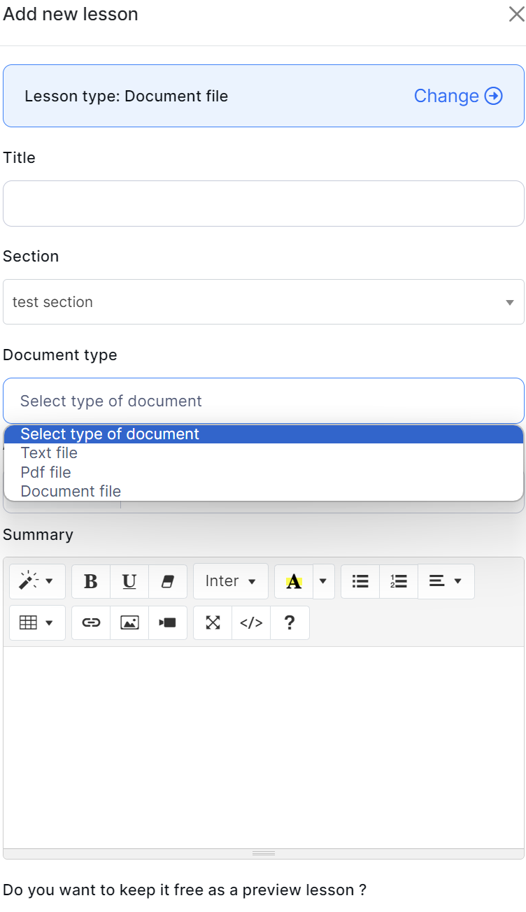 Next, a window will pop up, where you can select a checkbox for the type of lesson you want to upload. In this section, you can get the lesson types like: