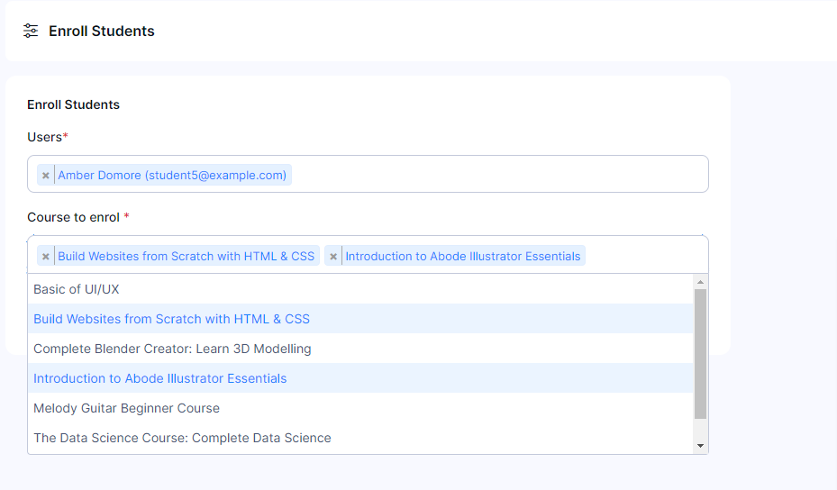 Next, click on the empty field for Course to enroll, and choose the courses you want to enroll the student into. You can select multiple courses if you like. In this way, you can add multiple students to multiple courses at the same time.