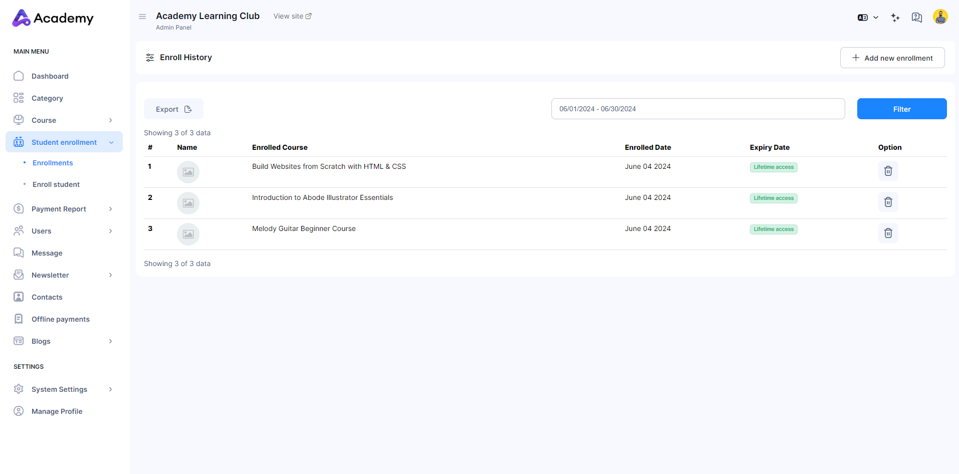 In Academy LMS Laravel, students can enroll in courses either by purchasing them directly or through manual registration by the admin. As an admin, you can enroll students manually by following the steps below: