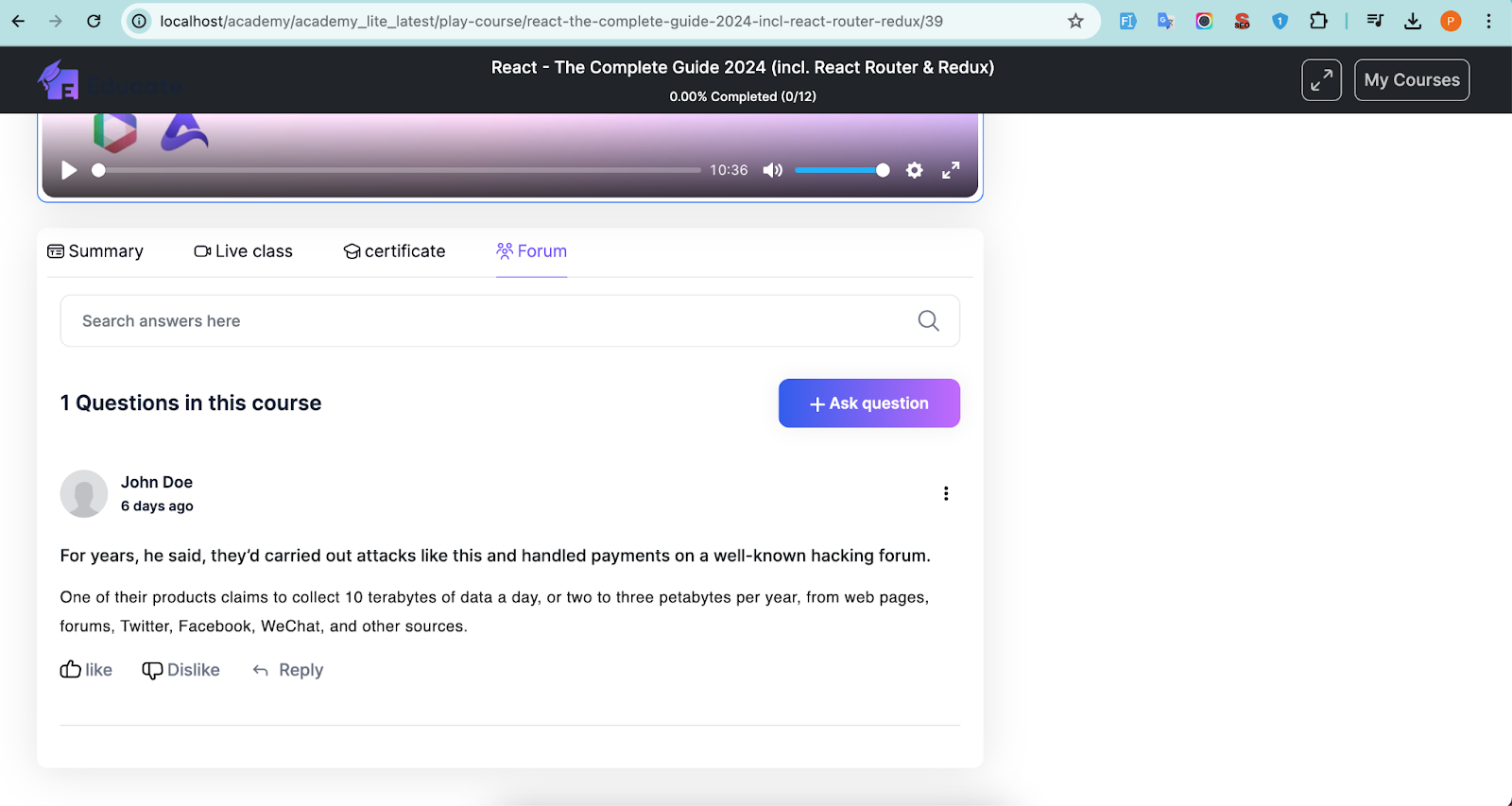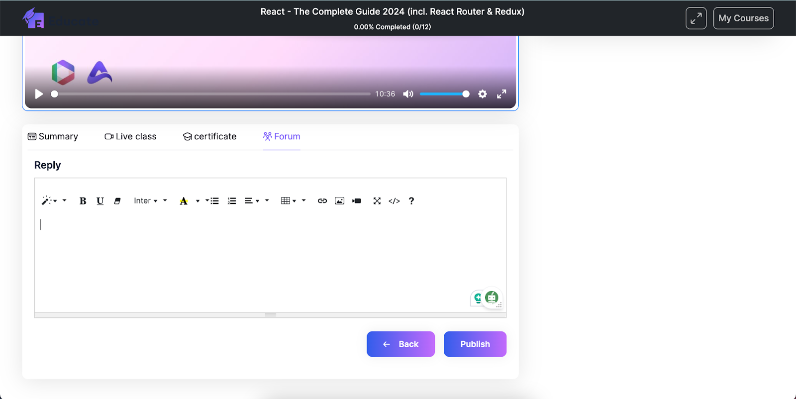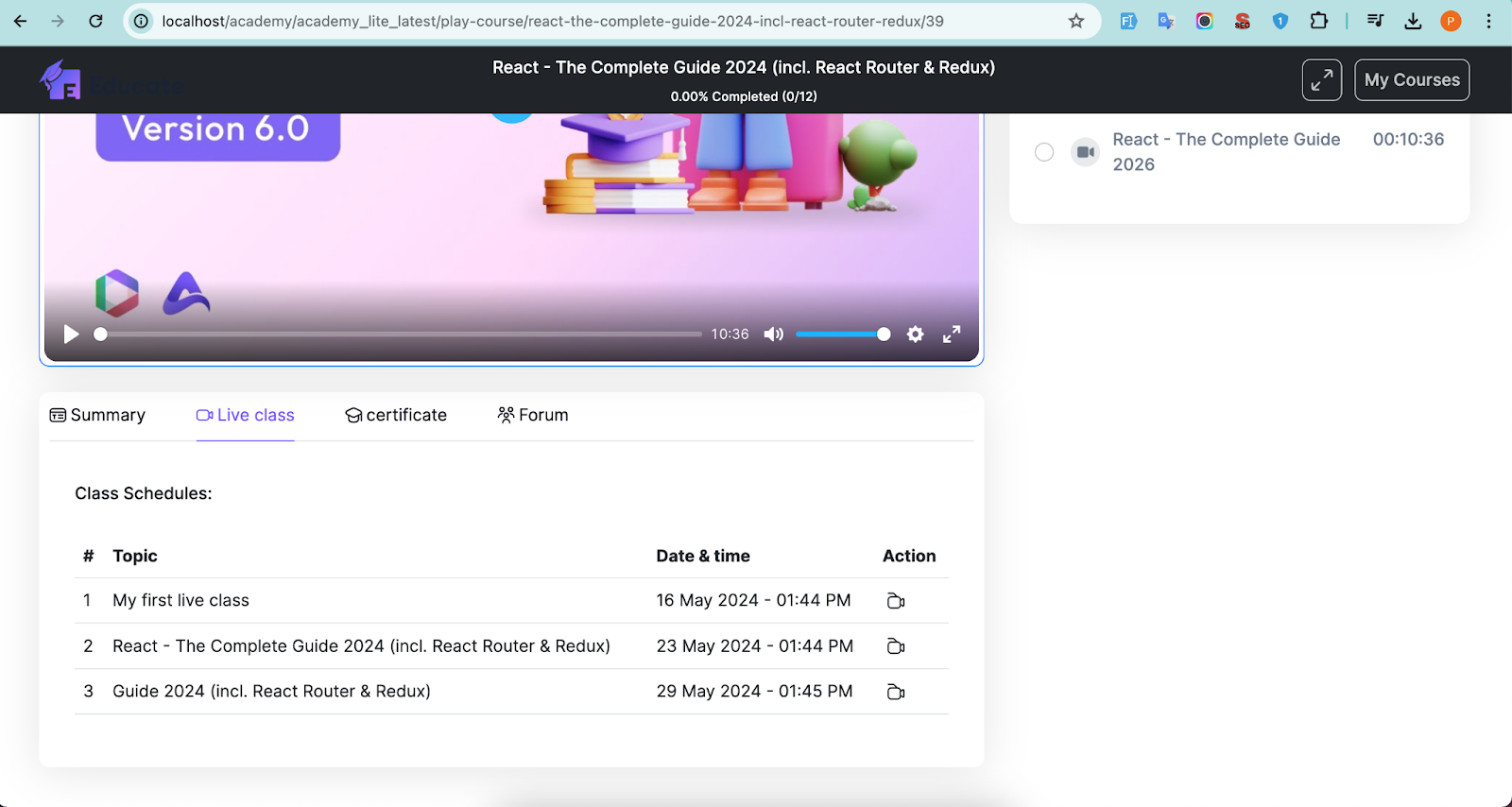 You can view all course content, summary of the course, Live classes, certificate, forums inside the course.
