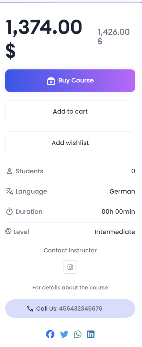 After clicking on a course, you can view the course details in the next page such as: Course title, instructor name, number of enrolled students, total taught hours in the course, and the language of the course.
