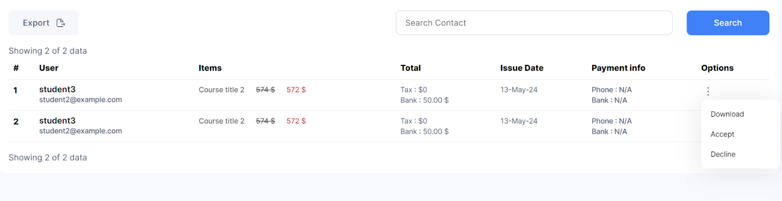 The offline payment page will show all the necessary payment details of the student. You can accept or decline the payment from the system, and even download a print of the receipt.