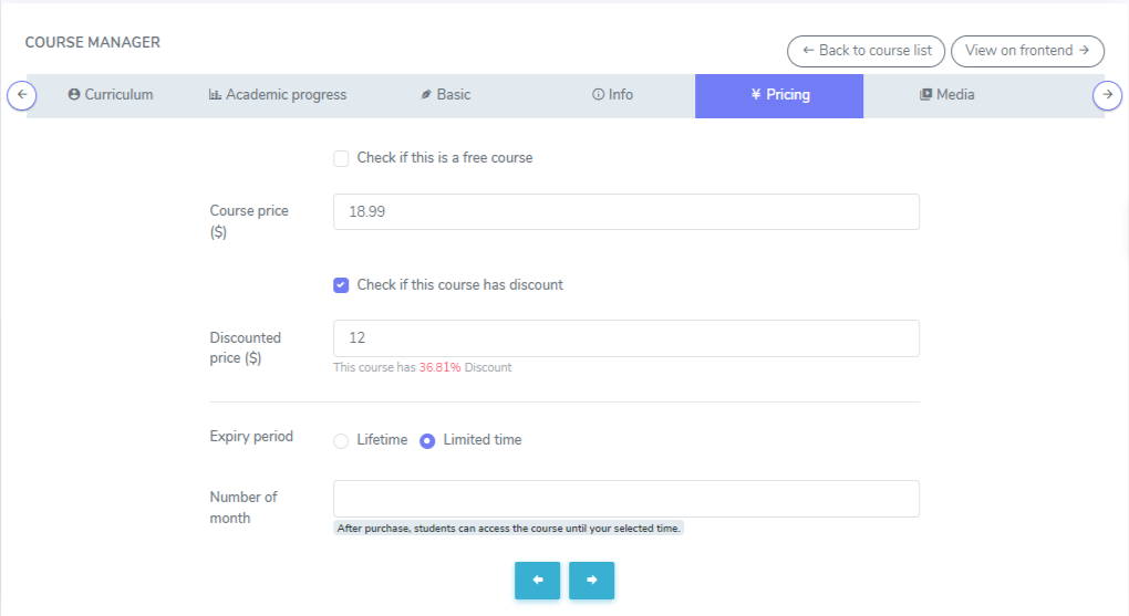 The course instructor can set the price of your course to this panel. Here, they can make a course free or create a discount. Now provide the course price. If they want to sell your course at a discount, then input the discount price. Also, the course instructor can add the course expiry period. The course instructor can make the expiry period lifetime or add customize time.