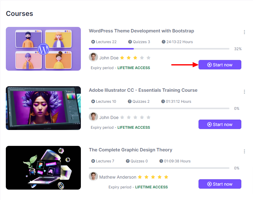 To start learning, you have to start watching the lesson. For this, you have to follow: