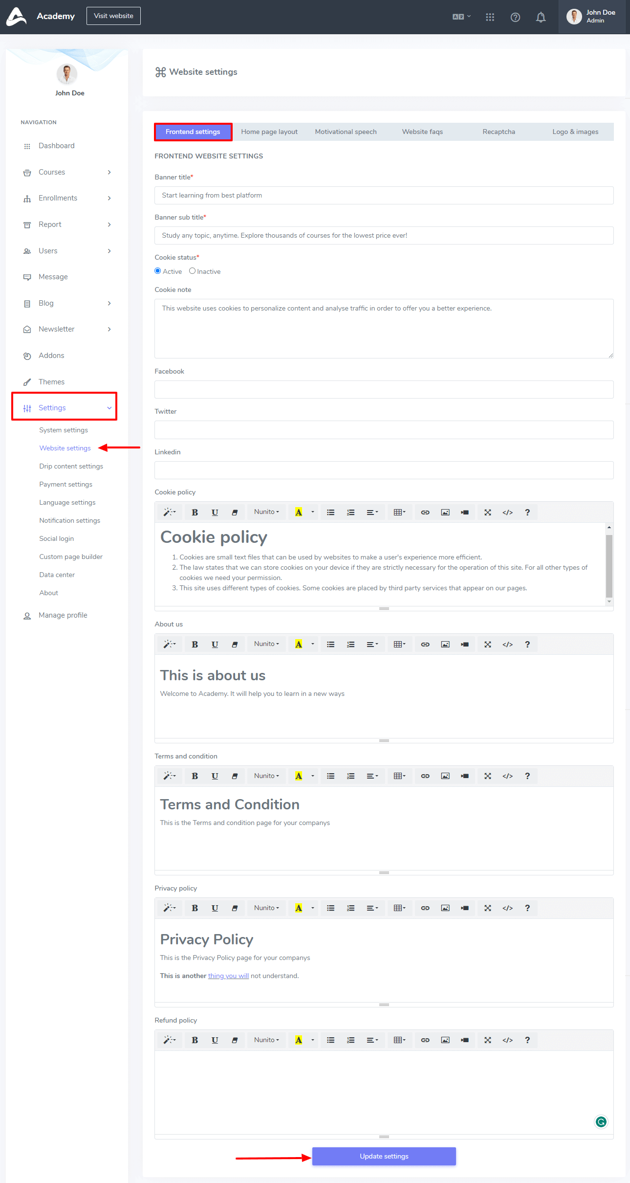In this settings option, you can update your banner title, banner subtitle, Cookie status, cookie note, add social media links, Cookie policy, about us(application), terms and conditions, privacy policy, and refund policy. To update this information, you can follow the steps below: