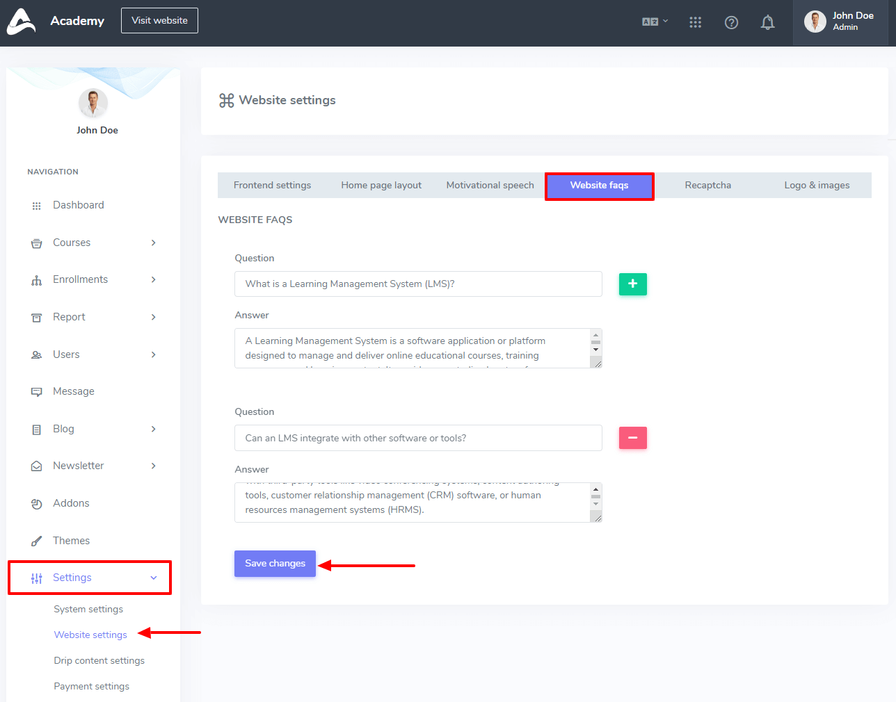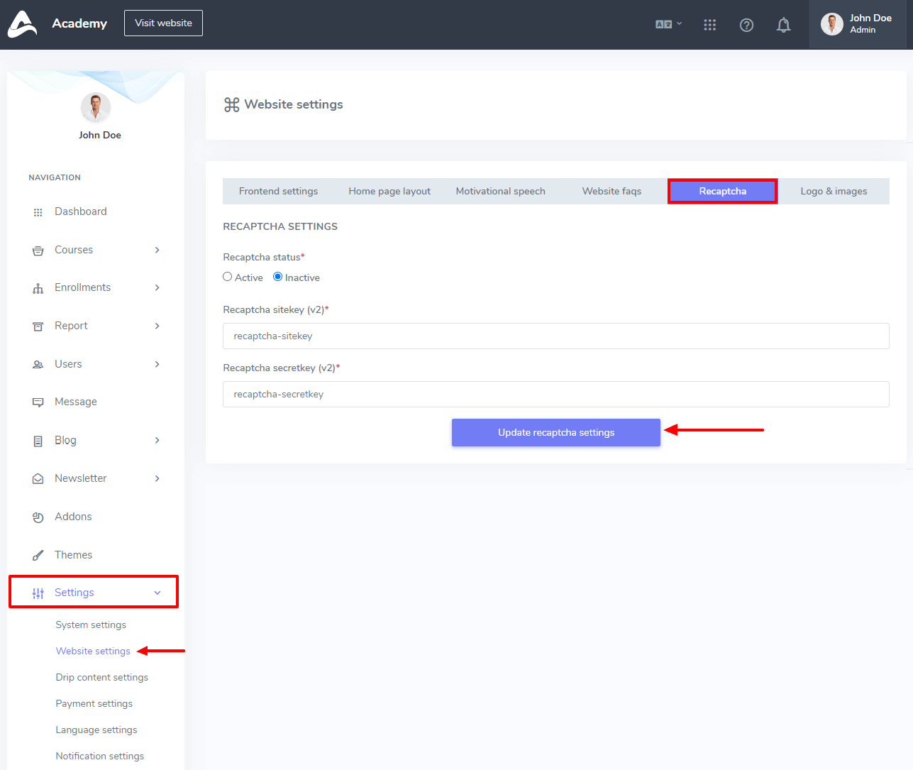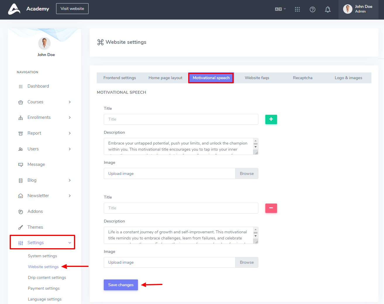 In this settings panel, you can configure your all settings which are related to your website. For example, Frontend settings, Homepage layout, Motivational Speech, Website FAQs, Recaptcha, and logo- images.