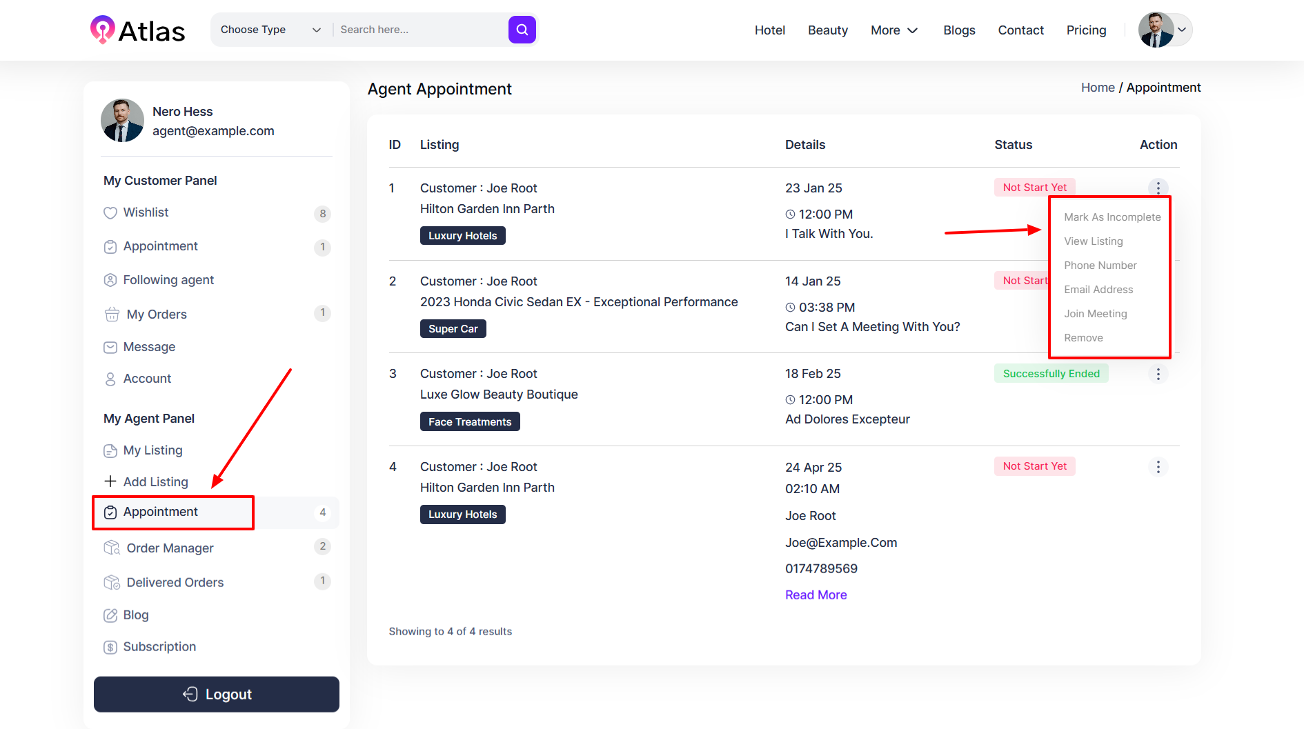 Click the Action button (three dots), and a menu will appear with Make As Incomplete, View Listing, Phone Number, Email Address, Join Meeting, and Remove.