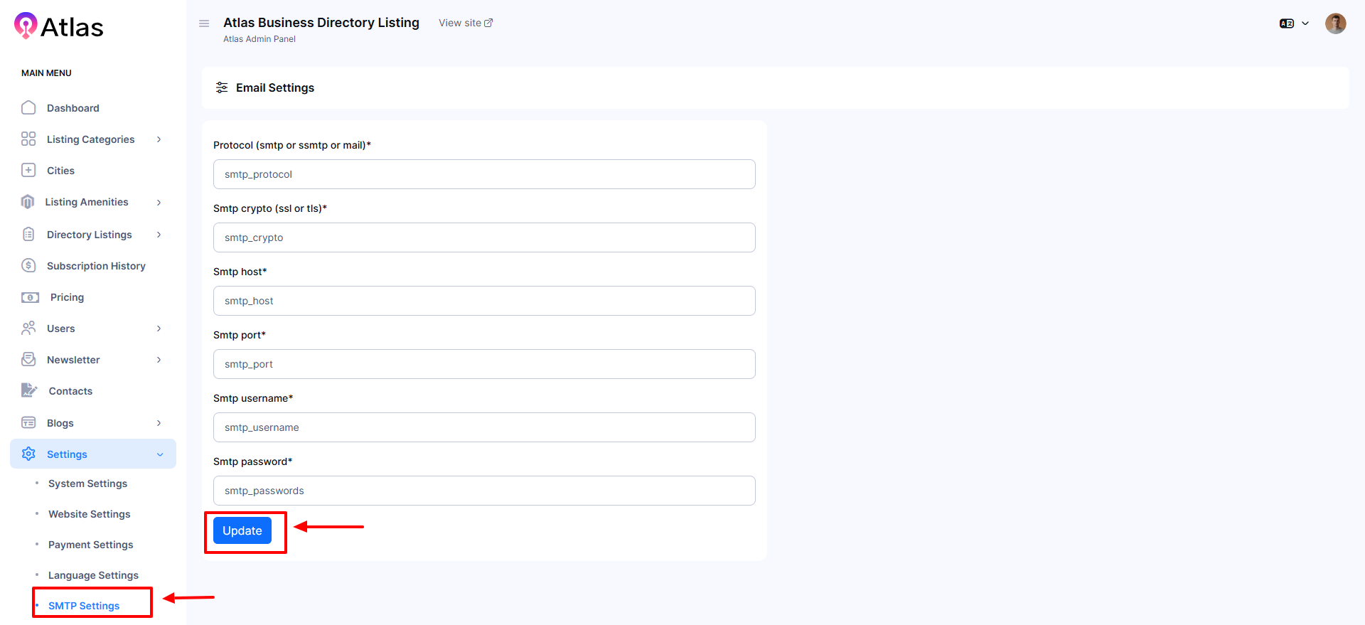 In Atlas Laravel, SMTP Settings ensure reliable email communication. Admins can configure the SMTP server to send emails securely, enhancing message delivery and minimizing errors. Proper setup helps businesses manage notifications, customer interactions, and transactional emails smoothly and efficiently.