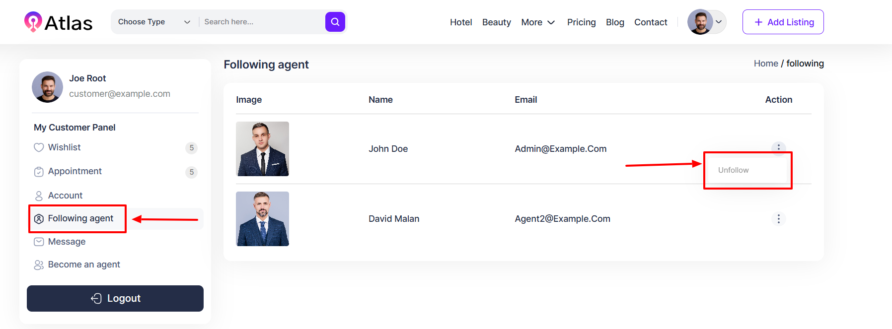 In Atlas Laravel, managing the following agents is simple. Add, edit, or remove agents to streamline tasks. Agents handle listings and clients. They also improve efficiency, build trust, and help your business grow faster and more effectively.