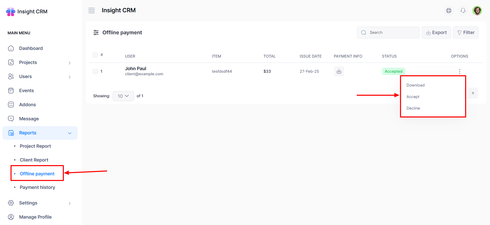 Insight CRM’s Offline Payment feature enables businesses to record and manage payments made through bank transfers, cash, or manual methods. It ensures accurate financial tracking, improves transparency, and supports seamless reconciliation between clients and internal accounts.