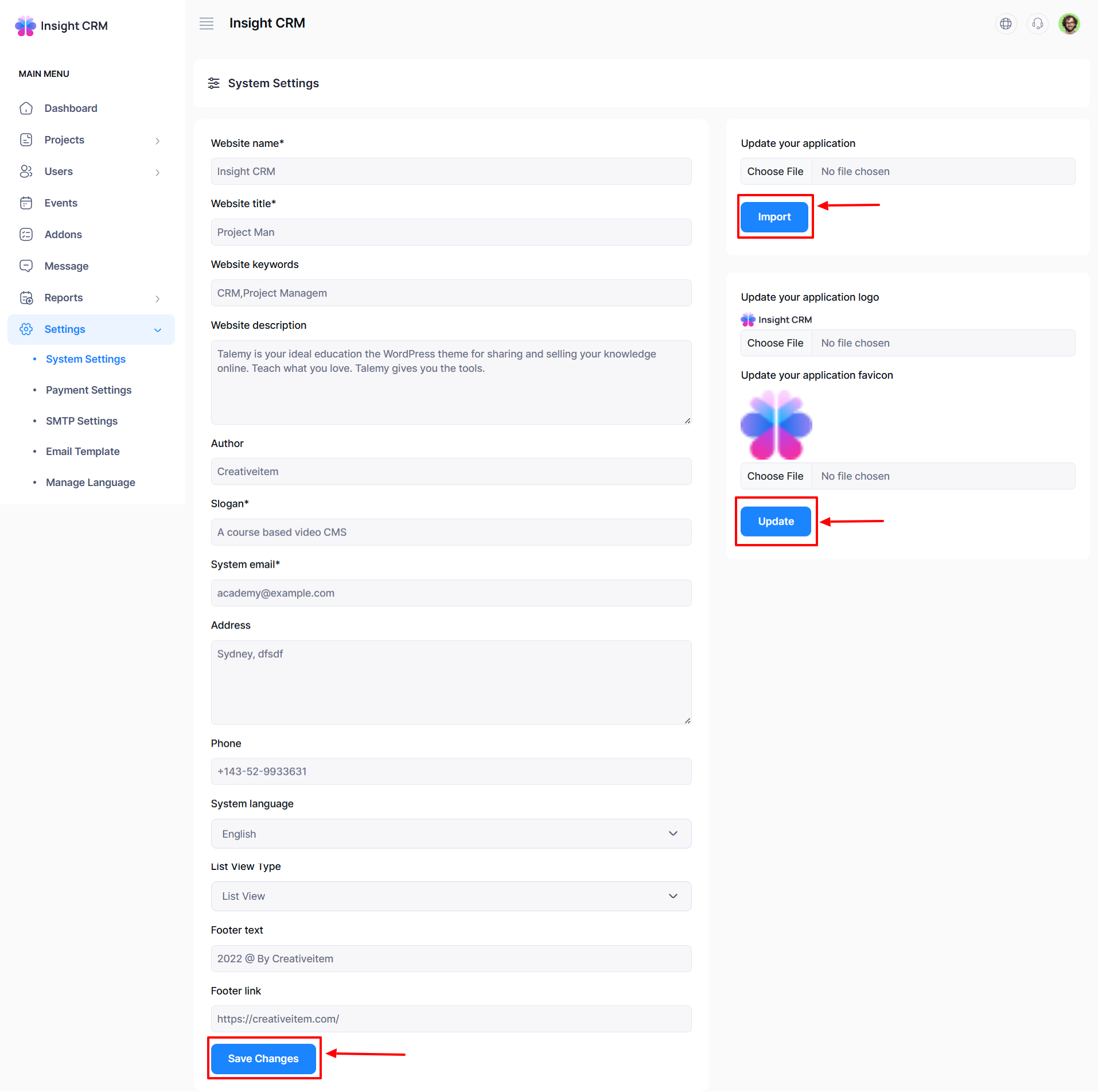 In Insight CRM Laravel, System Settings helps businesses control core platform configurations. Admins can manage language, currency, time zone, and other essential settings to optimize functionality. This ensures a smooth user experience, efficient operations, and a customized platform aligned with business needs.