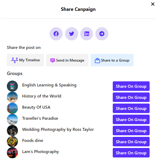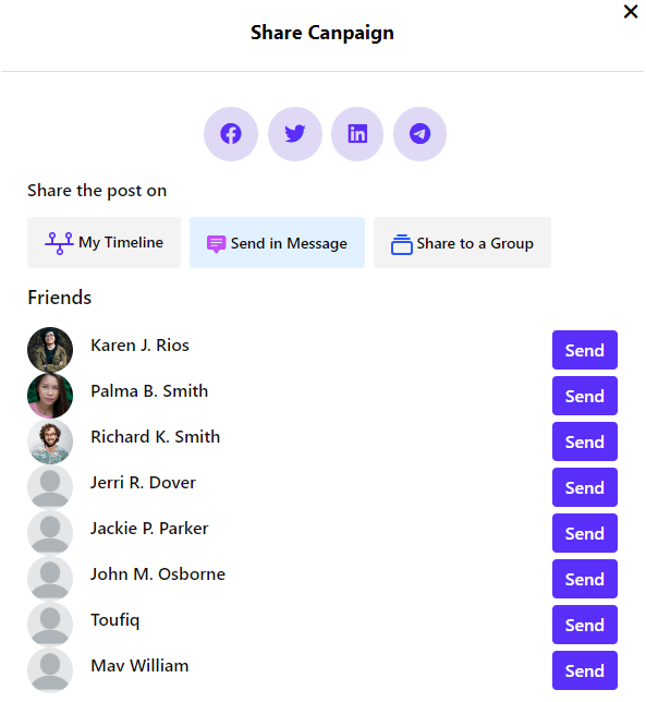 You can also share your Fundraiser to your profile timeline, send messages to your friends, and share to a group by selecting "My Timeline", "Send in Message", and "Share to a Group" buttons.