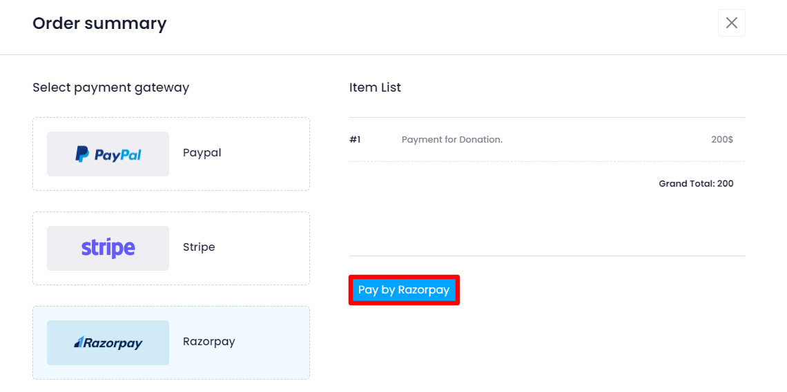 Select the payment gateway and click on the "Pay by" button for further purposes.