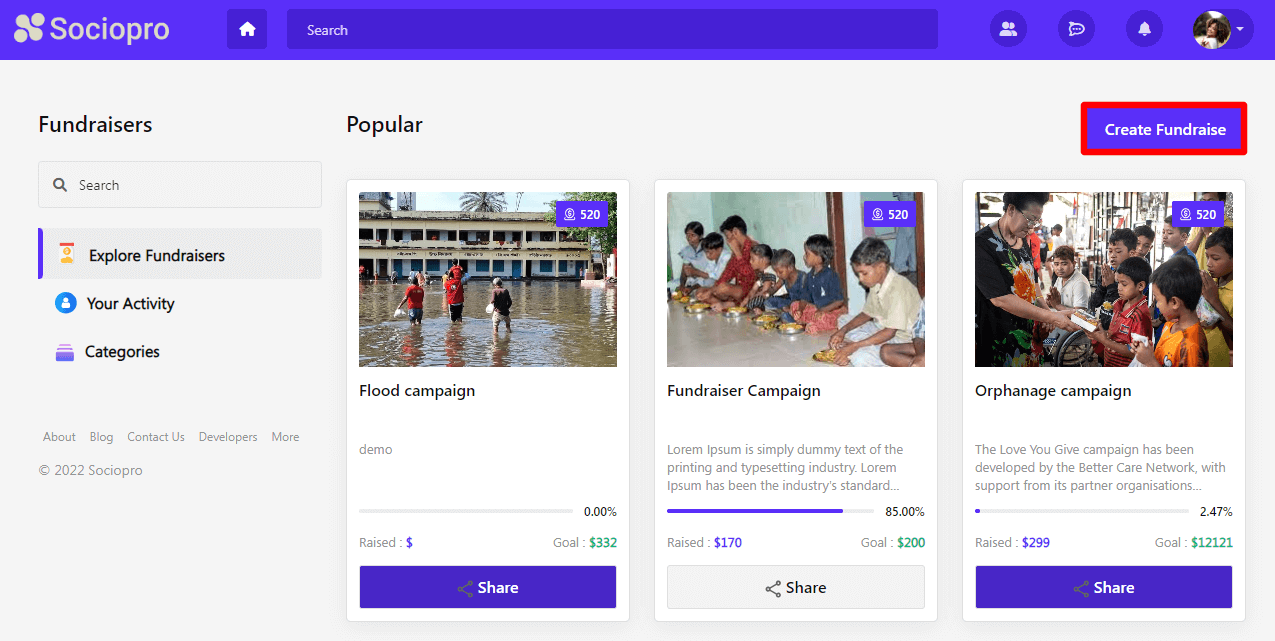Here you can view the list of fundraisers that have been created & still raising money. For creating a fundraiser click on the "Create Fundraise" button from the right side.