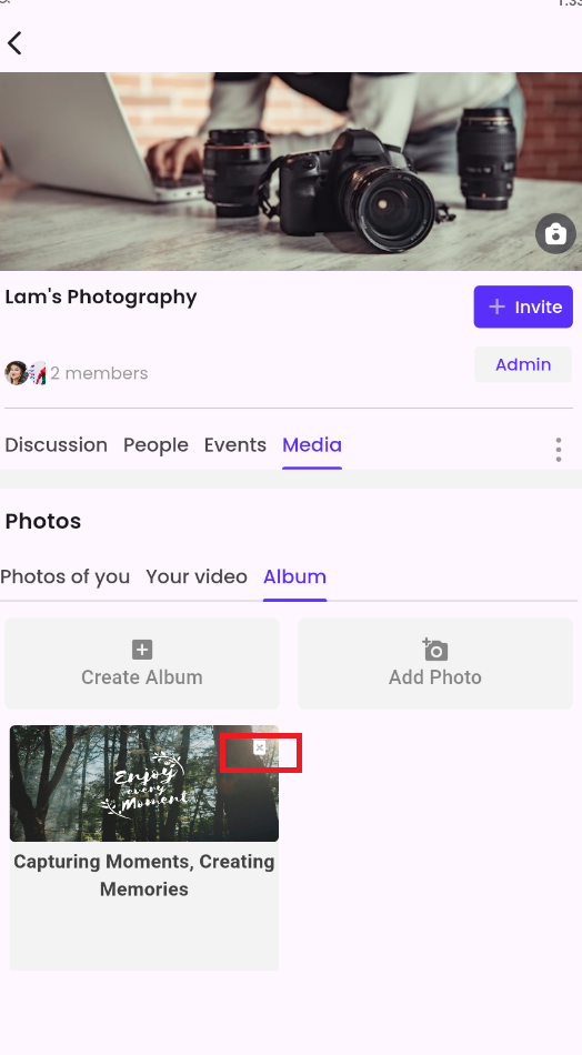 Only the group admin can remove a group album from the application. To remove an album from the group, the group admin can follow the steps below: