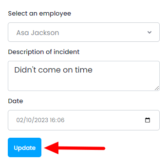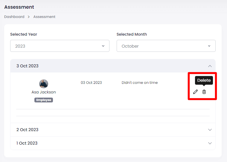 To record an assessment, select a user first from the right side, write down the reason for the incident, select the time and date, and click on the "Add incident" button for recording an assessment.
