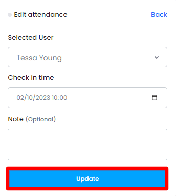 To record attendance you need to select a user first from the right side. Then select the status and time. Write a note and click on the "Submit" button to record the attendance.
