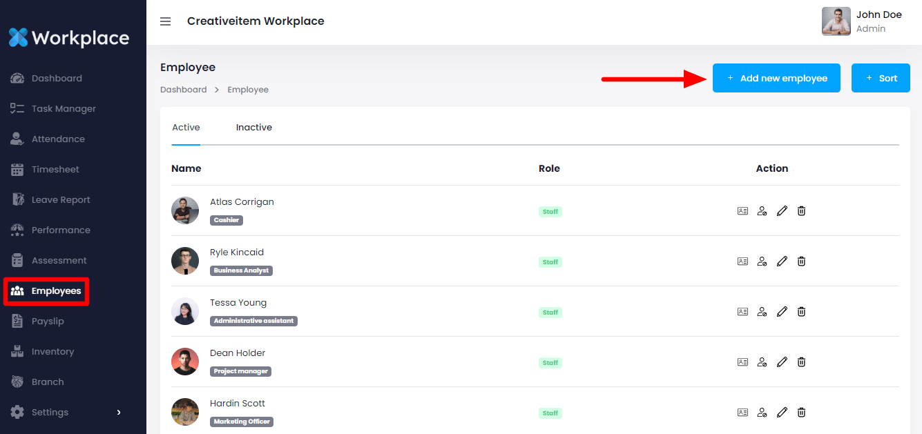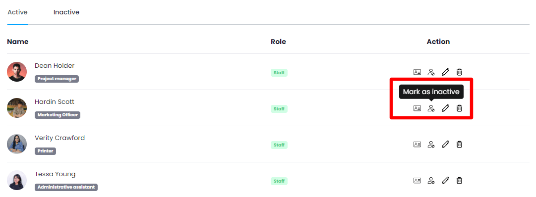 You can view employees' profile information by clicking on the view profile information icon from the employee list.