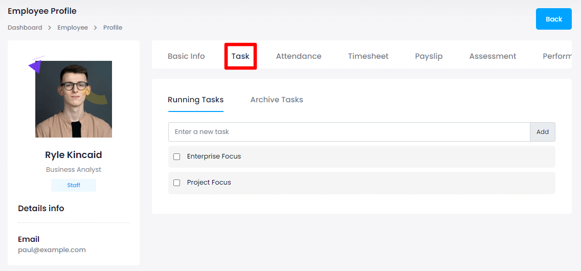 You can view the users assigned tasks from the "Task" section. You can also assign tasks to the user from this section as well.
