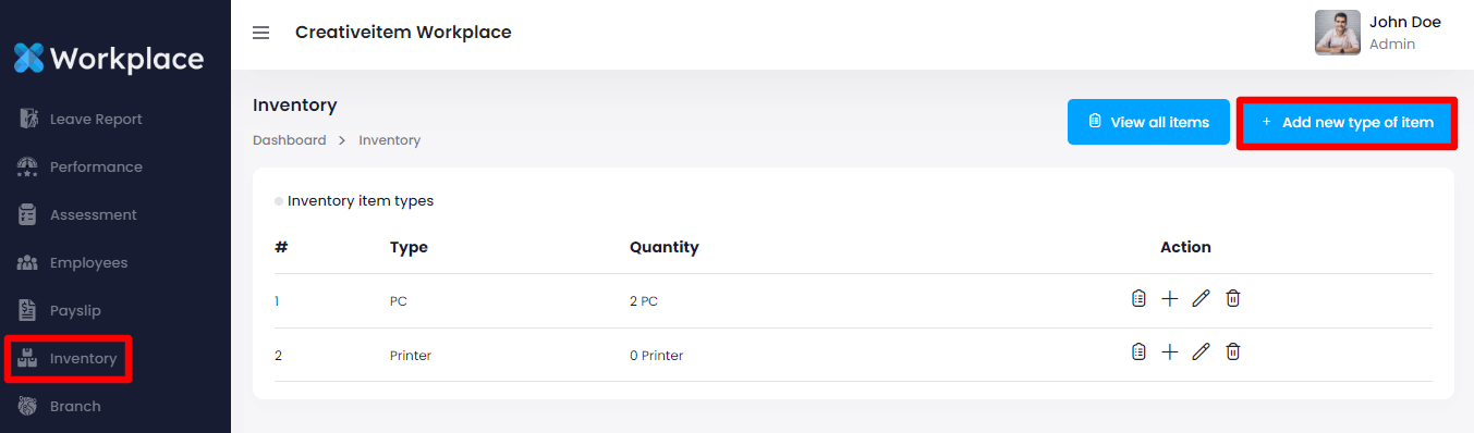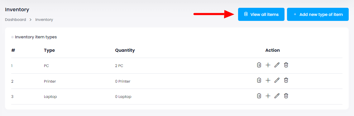 Here you can view the inventory item list. You can also add a new item to the list by clicking on the "Add new item" button from the right side.
