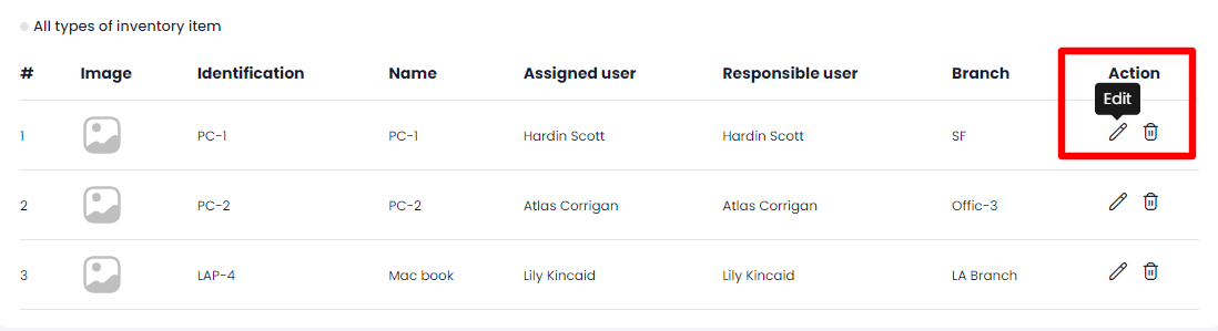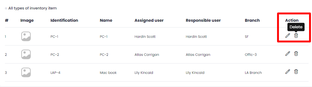 You can add, edit, and delete inventory by clicking on the icons from the action bar.