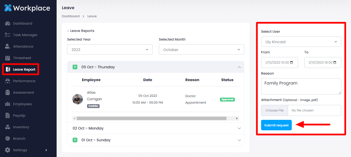To create a leave report select a user first from the right side, select time, write down the reason, and attach a picture. Then click on the "Submit Request" button to create a leave application.