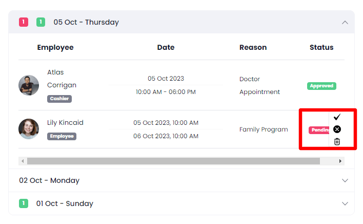 As an admin, you can approve, reject, and delete the request anytime by clicking on the icons.