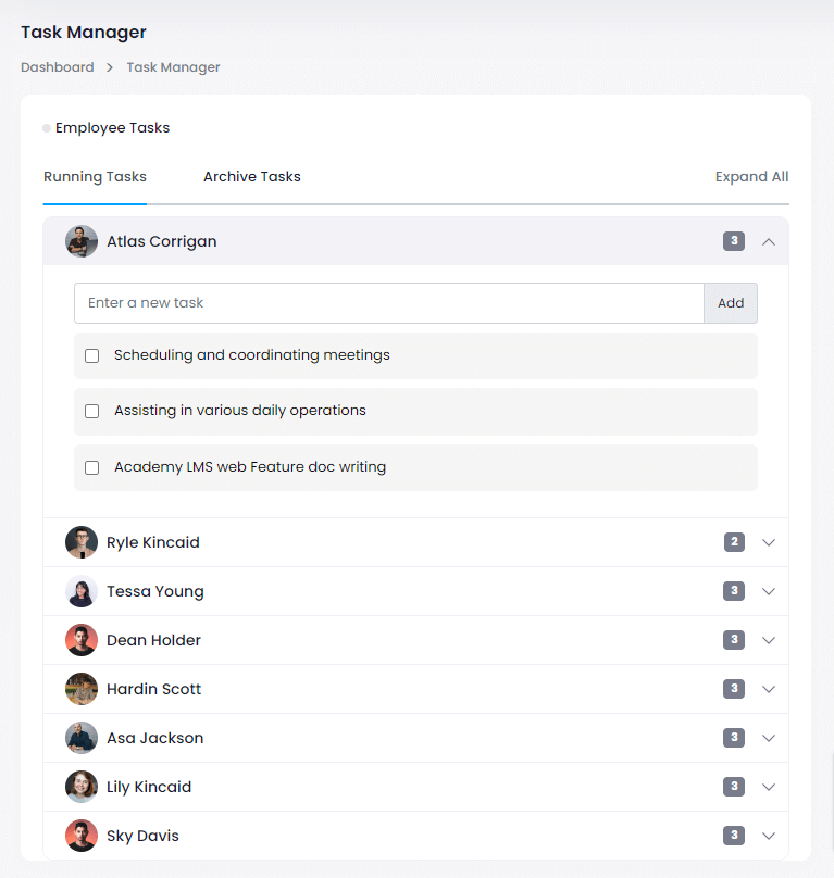In this section, as an admin, you can view and assign tasks to the users. You can mark tasks as completed and archive the tasks anytime from this section.