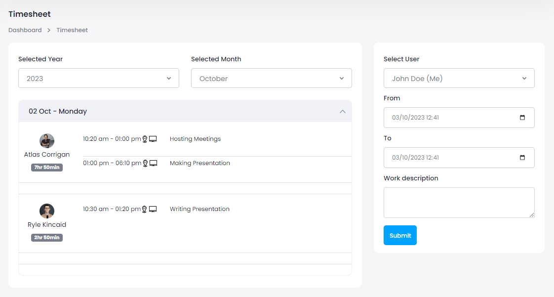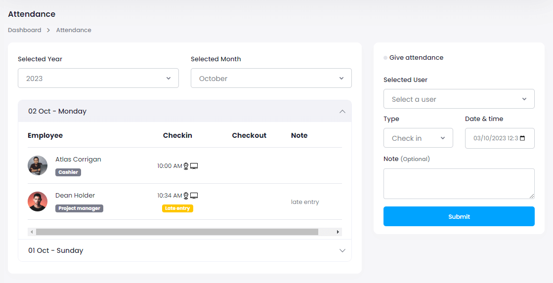 You can give attendance to your employees from this section. You can store their check-in time and checkout time alone with a note.