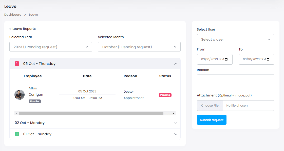 In this section, you can view and create leave requests for the users. As an admin, you can also approve and reject leave requests submitted by the users.