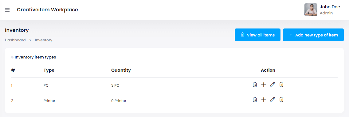 As an admin, you can add inventory items from this section. You can add all the small kinds of items and select the responsible users as well from this section.