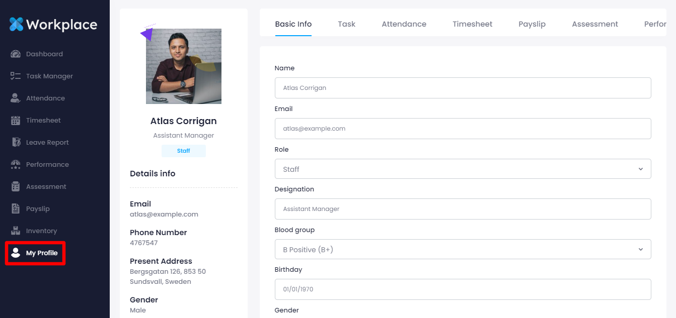 Here they can view and update their basic information from the basic section. Also, they can view other additional information from the Task, Attendance, Timesheet, Payslip, Assessment, Performance, Leave, and Inventory sections.
