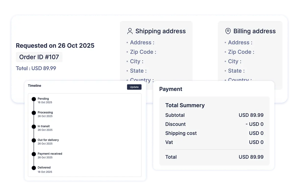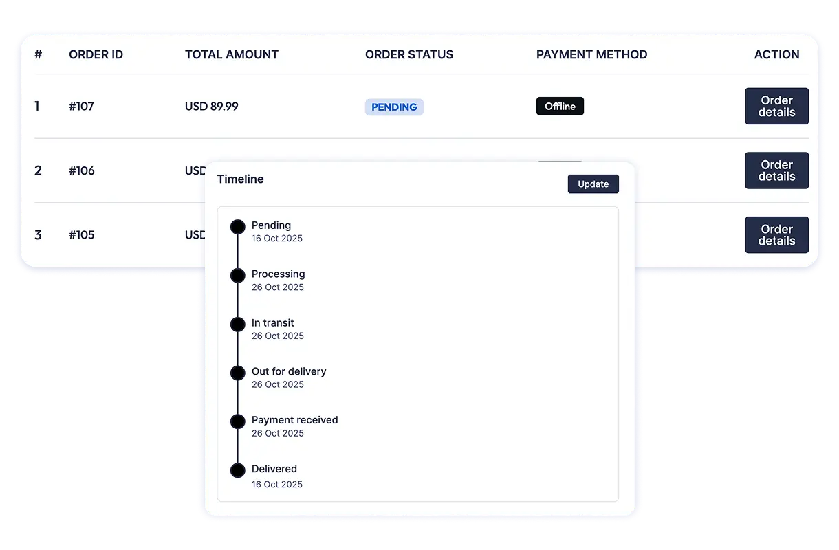 Track and update orders in real time, keeping customers informed from purchase to delivery.