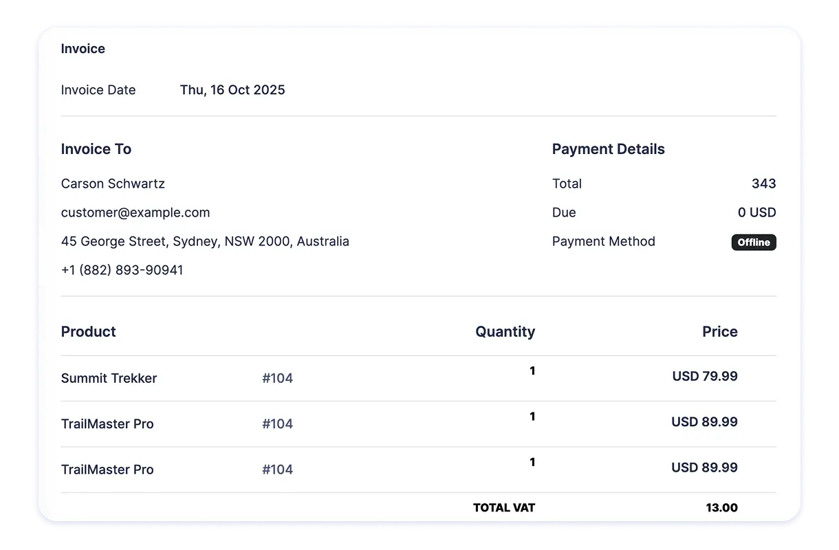Provides a transparent, well-organized view of products, prices, taxes, and payment status in one place.