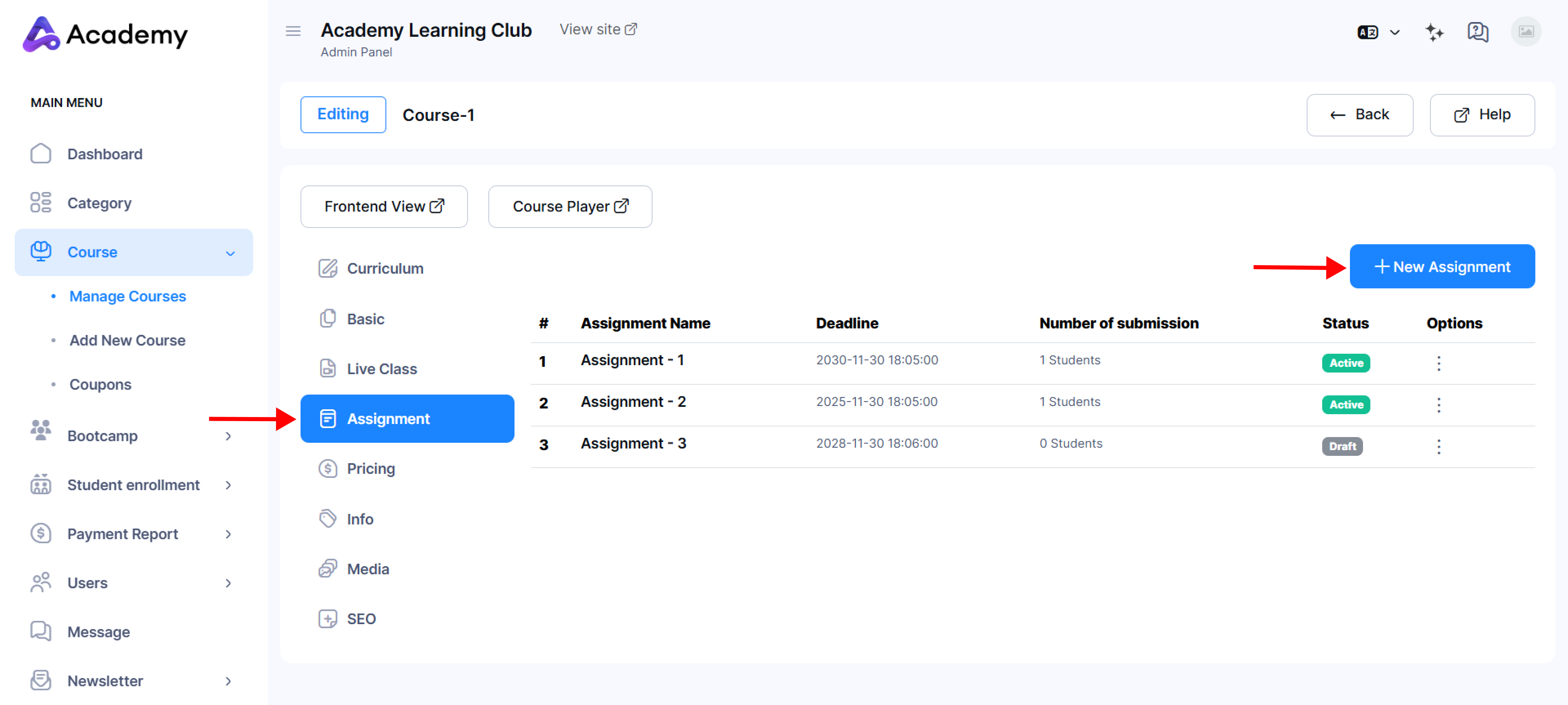 Your instructors can also publish assignments based on their courses (If you allow public instructors on your application). The site admin and instructors can create, publish, update, delete, review, provide marks and comments, and mark as drafts their assignments course-wise. For this, you can follow the steps below: