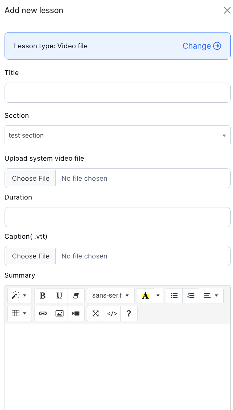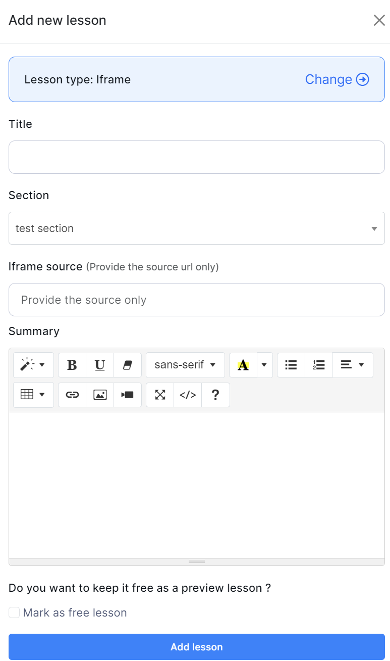 Select the "Add lesson" button to add a new Youtube video lesson.