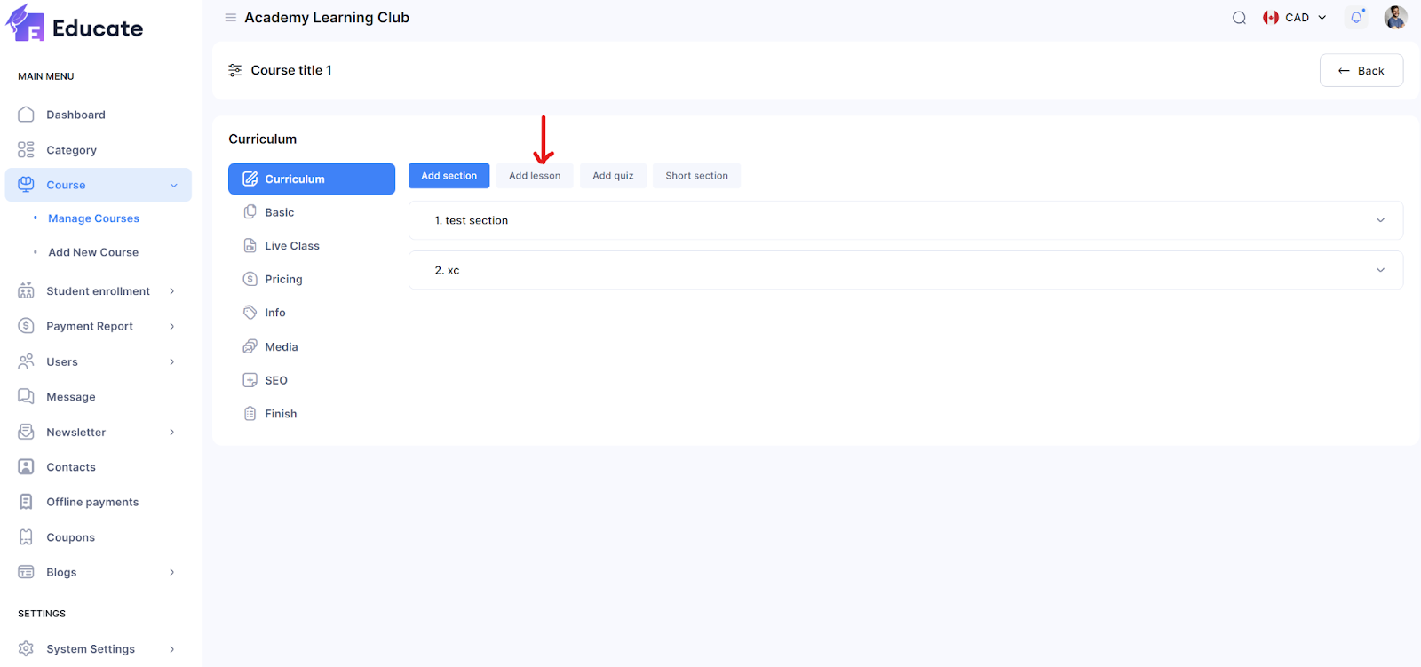 As an admin/instructor, you can create as many lessons as you would like to a single course. Follow the steps below to create lessons: