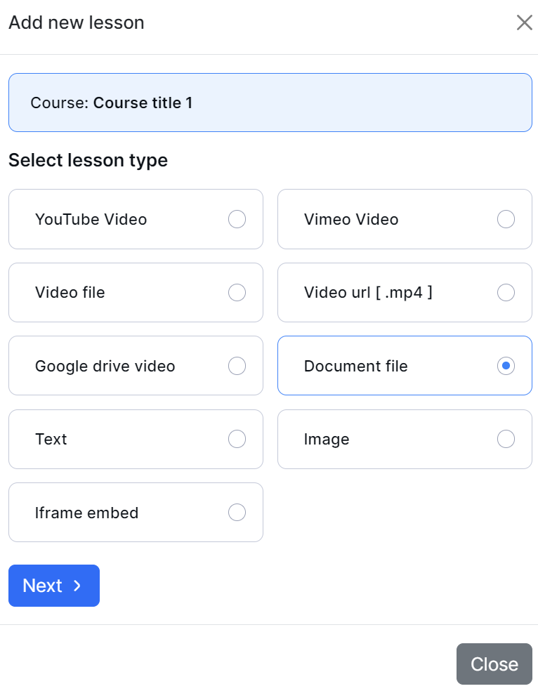 Next, a window will pop up, where you can select a checkbox for the type of lesson you want to upload. In this section, you can get the lesson types like: