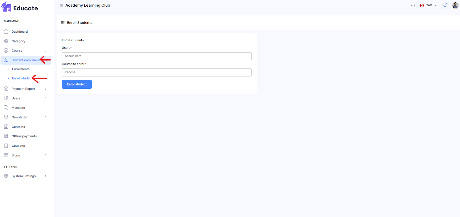 In Academy LMS Laravel, students can enroll in courses either by purchasing them directly or through manual registration by the admin. As an admin, you can enroll students manually by following the steps below: