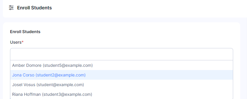 Next, click on the empty field for Course to enroll, and choose the courses you want to enroll the student into. You can select multiple courses if you like. In this way, you can add multiple students to multiple courses at the same time.