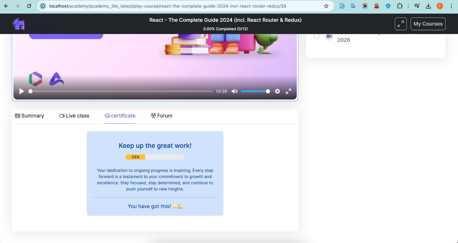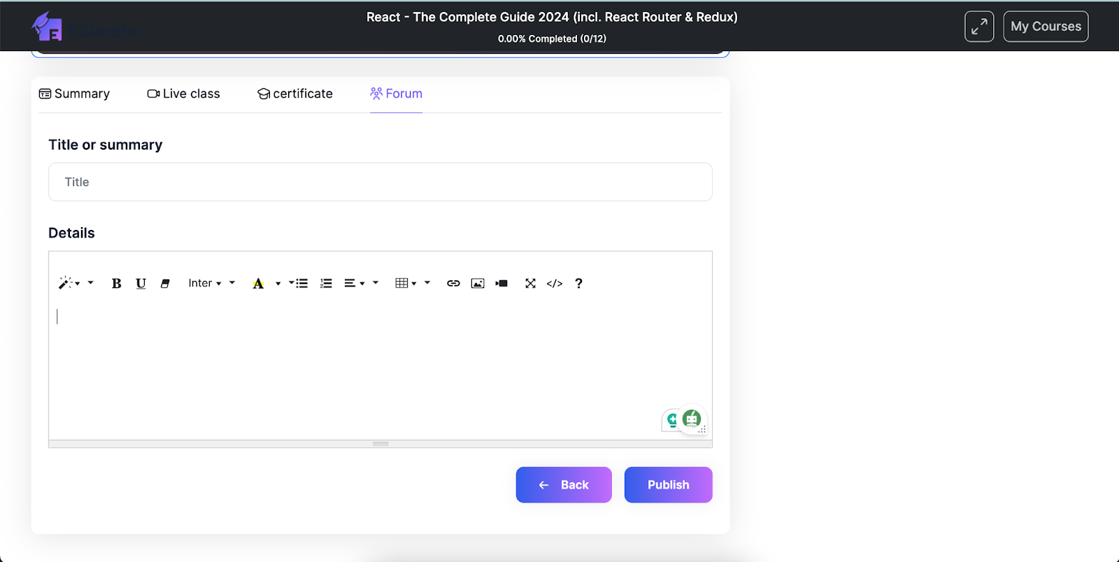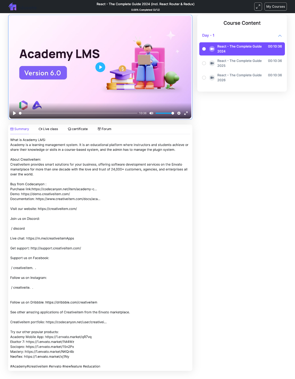 You can view all course content, summary of the course, Live classes, certificate, forums inside the course.