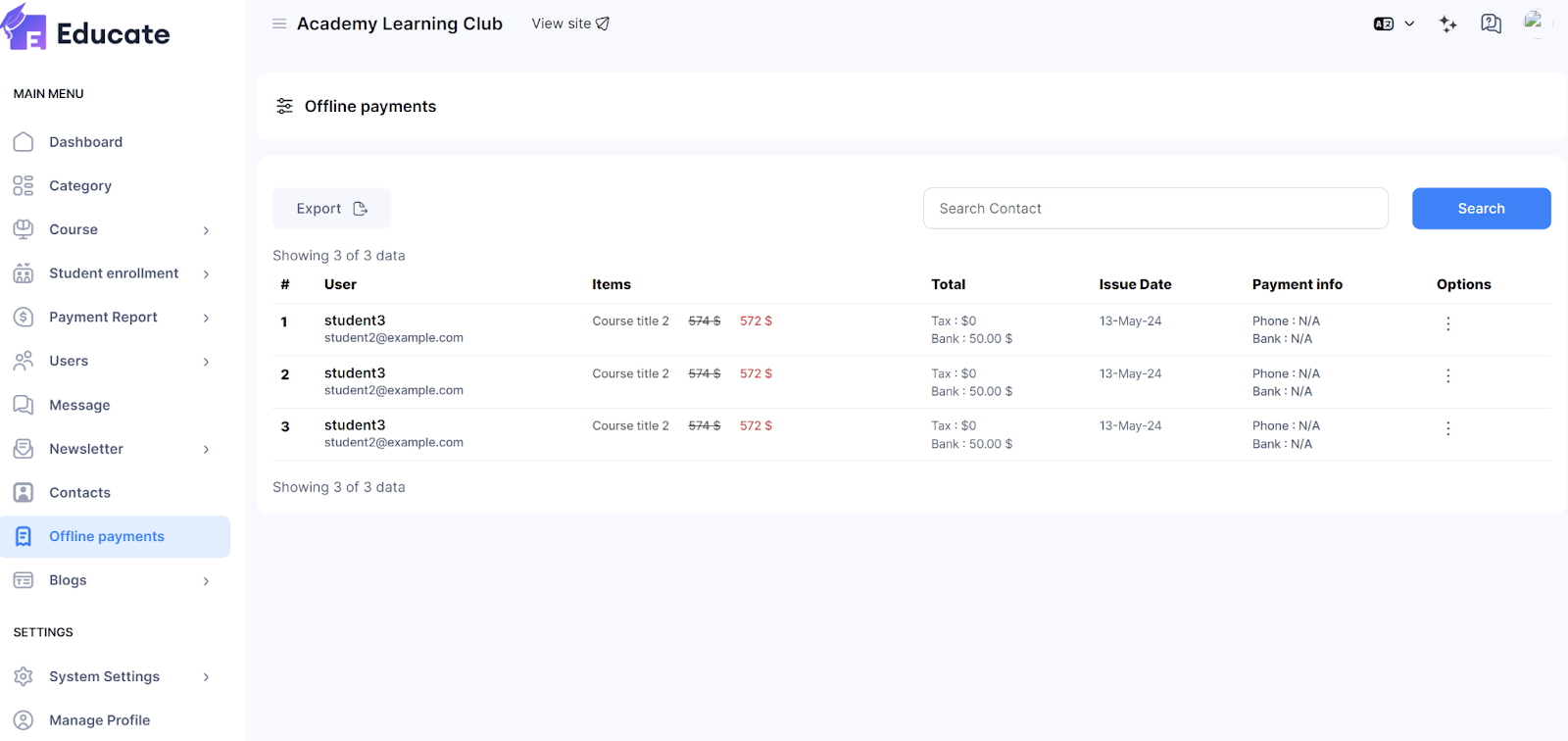 Click on Offline Payments from the left side bar, and you will see the details of the payments made online, with the user name, items purchased, total price, issue date, and payment information.