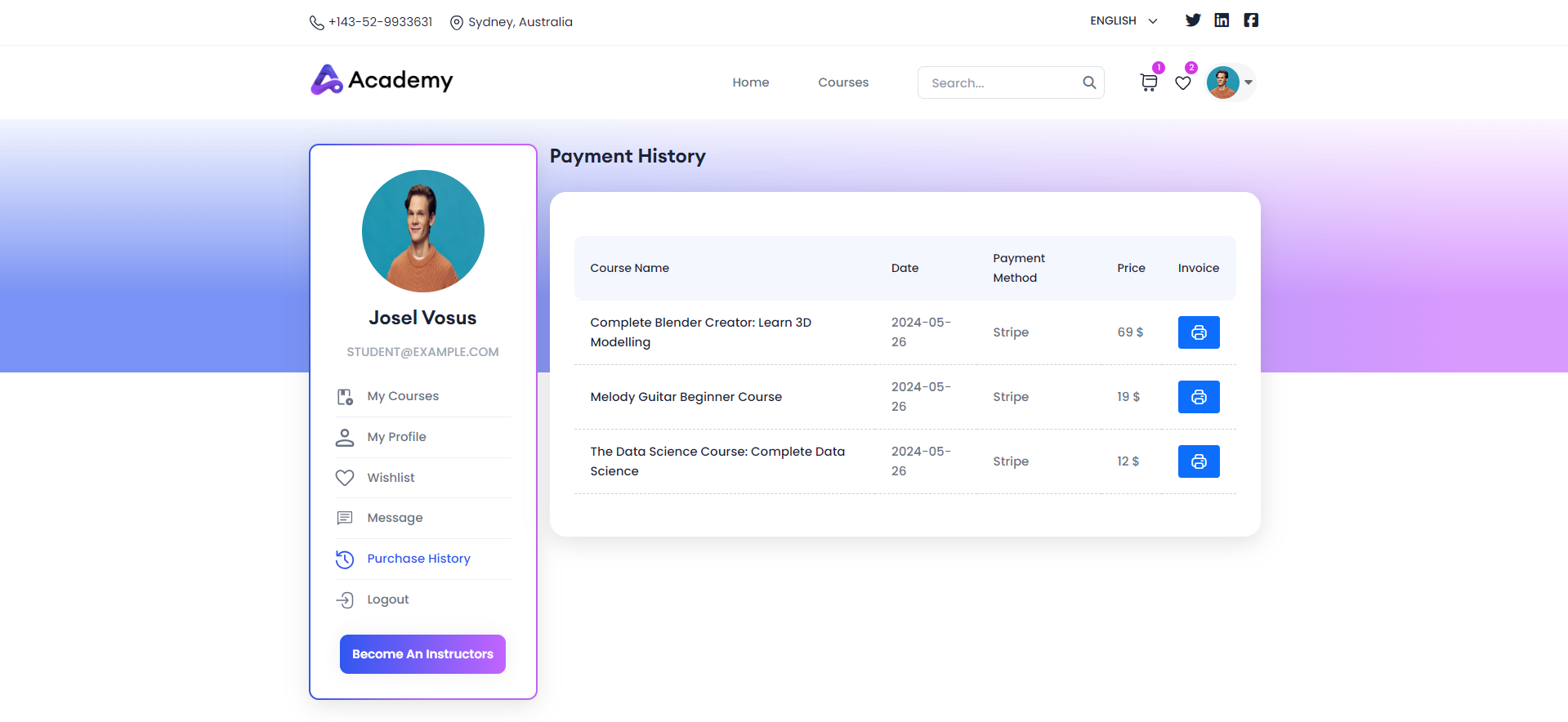 The purchase history will be shown with the course names, date of purchase, payment method, price and the invoice.