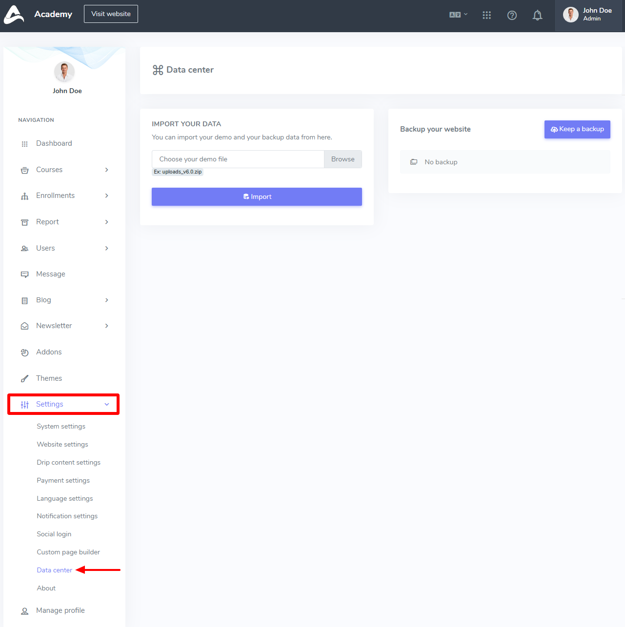 You can easily restore or make the backup data on Academy within a few clicks as an Admin. You can also create multiple backups, import demos, and export or remove your backup data file from your devices.