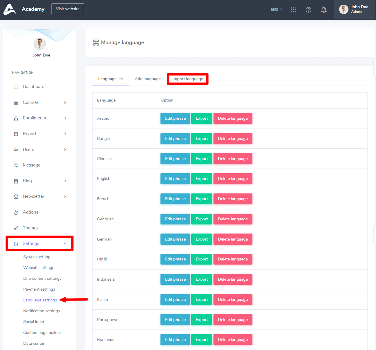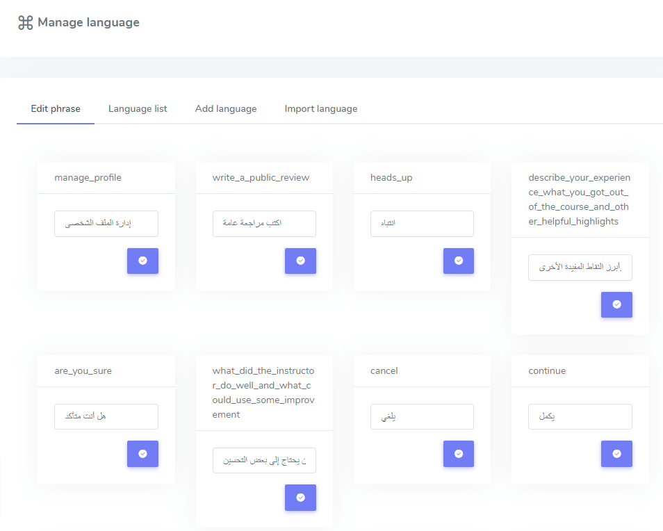 You will get 14 languages different from Academy LMS. You can change the system language of our application at any time. You can add any language and phrases to the application. Also, you can import or export languages as JSON files from the application.