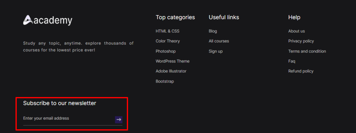 A newsletter is a regular publication that is sent news/information to the subscribers of your application through email. You can share news/information/updates to make your users more engaged in Academy LMS. Your users can subscribe to your application from the home page of your application.