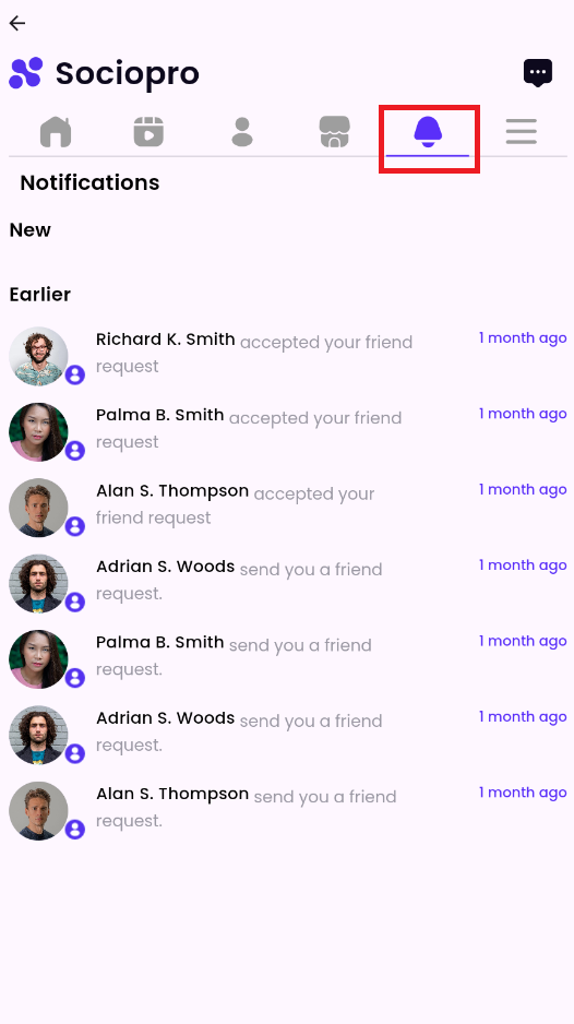 Your users will get notifications if the user gets any kind of request or invitation in Sociopro. To the notifications, users can follow the steps below: