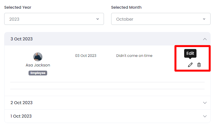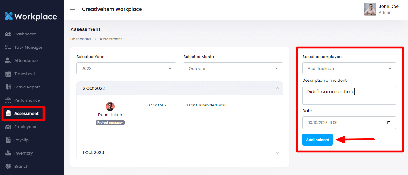 To record an assessment, select a user first from the right side, write down the reason for the incident, select the time and date, and click on the "Add incident" button for recording an assessment.