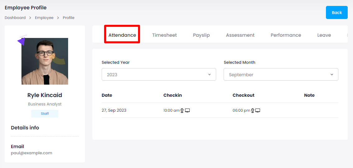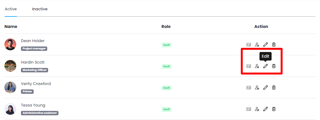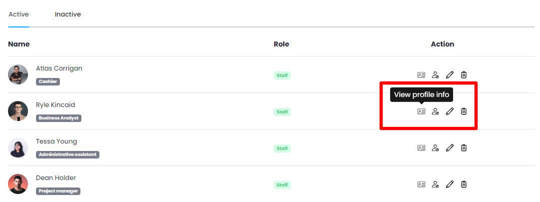You can view employees' profile information by clicking on the view profile information icon from the employee list.