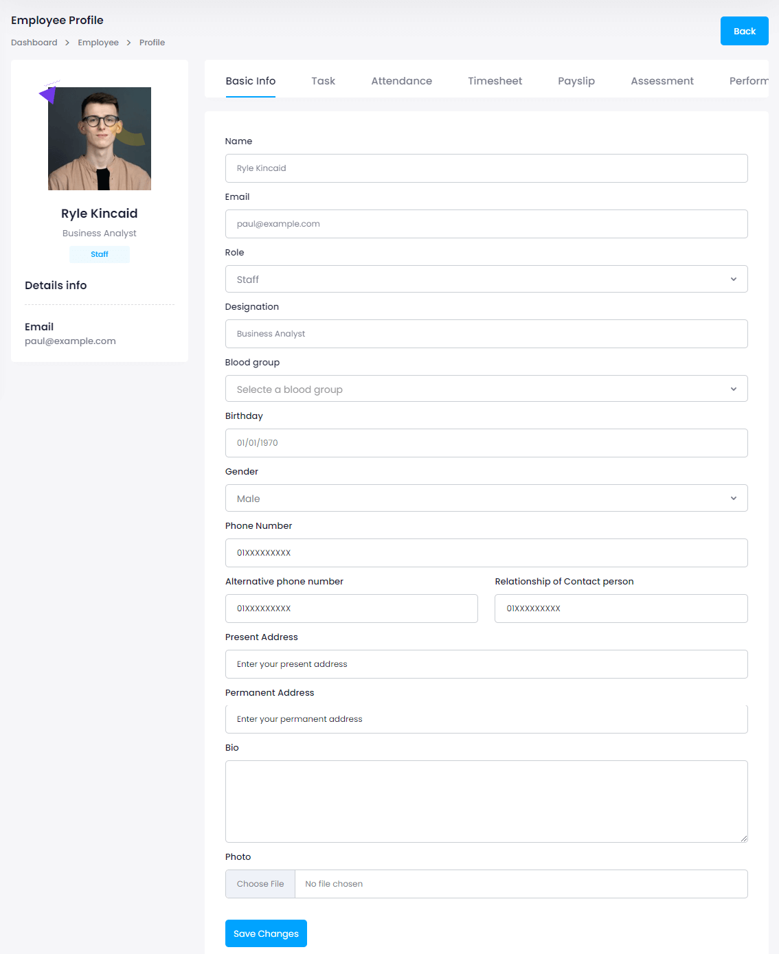 Note: User's Time sheets, Payslip Invoices, Assessments, Performance, Leave applications, and Inventory information are also viewable in the user profile.